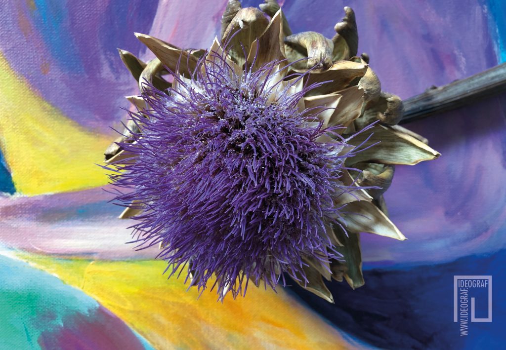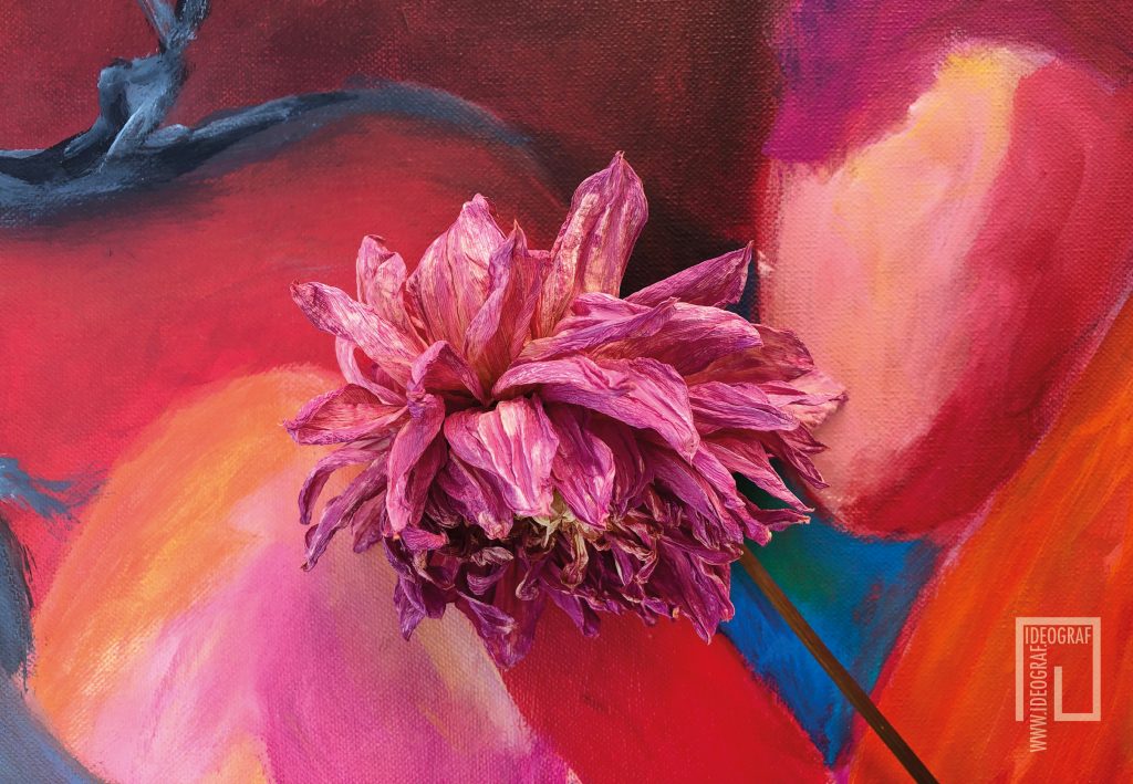 Die Geschichte zu dieser Bildserie beginnt in meinem Wohnzimmer. Meine Nachbarin schenkte mir eine Sonnenblume, die ich vor mein Bild an der Wand stellte. Leider vertrocknete sie durch meine geringe Pflege. Während ich noch darüber lamentierte, entdeckte ich, wie wunderschön diese Vergänglichkeit war und sich mit dem Bild auf fantastische Weise verband. Seitdem sammele ich bei meinen morgendlichen Spaziergängen begeistert Naturfundstücke und kombiniere sie mit meiner Malerei.